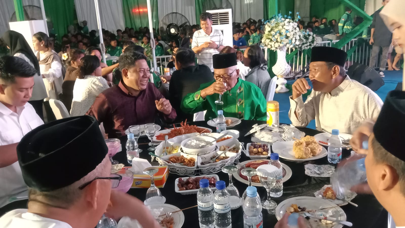 Jojon tampak duduk bersama mitra di meja tengah, yang dikelilingi tetamu lain. Mengenakan kemeja berwarna maroon, Jojon terus menampakkan tawa, hingga meladeni foto bareng bak artis ibukota.