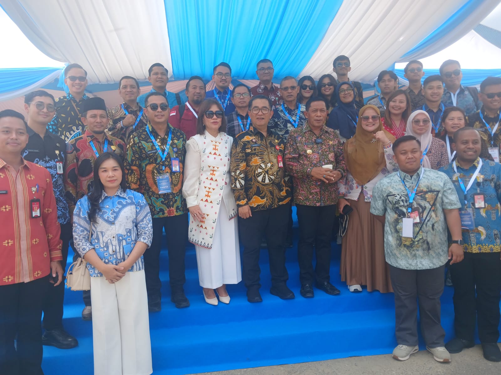 Dirjen otda Kemendagri, Akmal Malik, bersama Wakil Gubernur Sulawesi Tenggara, Hugua, foto bersama panitia pusat dari Kementerian Dalam Negeri, usai penutupan Rakornas Produk Hukum Daerah, Kamis (28 Agustus 2025). (Indri)